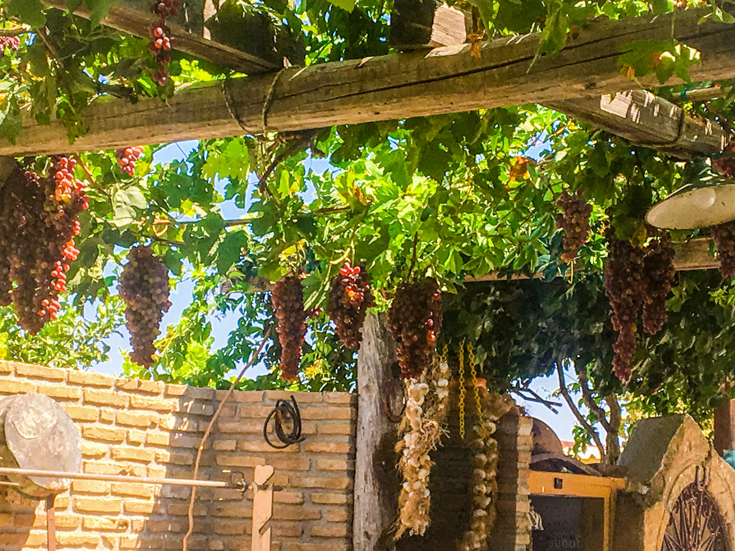 Wir ließen uns draußen im Schatten von Weinreben unsere Limo schmecken, dazu bekamen wir eigene Trauben und selbstgebackenen Kuchen serviert.